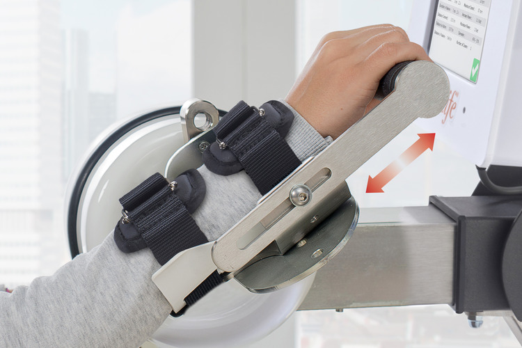 Wenn die Verwendung des Handbands nicht ausreicht, ermöglicht die Armlehne, den gesamten Unterarm zu halten und zu verankern, um ein korrektes Training der oberen Gliedmaßen auch für Tetraplegiker zu ermöglichen (zwei Stücke).