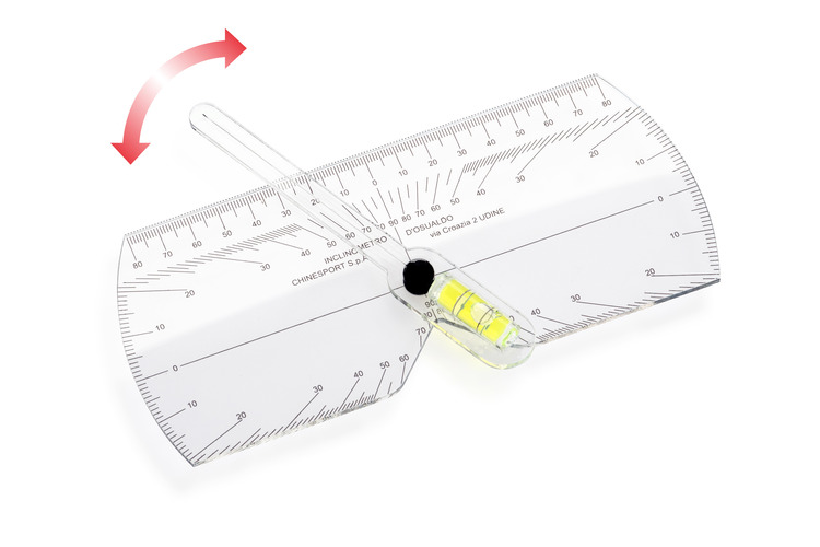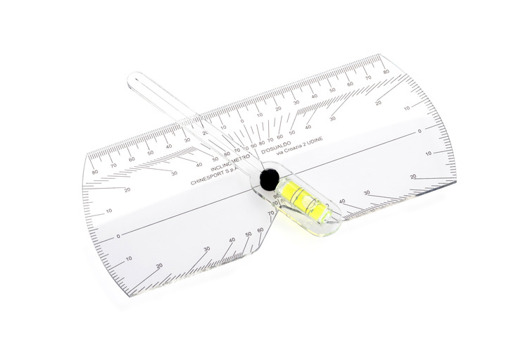 Das Neigungsmessgerät besteht aus einem fast rechteckigen Stück Plexiglas, auf dem eine goniometrische Skala gekennzeichnet ist und auf deren Mitte sich ein kleiner, sich frei drehender Stab mit einer Wasserwaage befindet; auf dem freien Ende kann man den Leseanzeiger zur Winkelskala erkennen. Die längste Seite des Rechtecks hat eine Aussparung, um die Anwendung beim Patienten einfacher zu gestalten, falls die Dornfortsätze hervorstehen sollten.