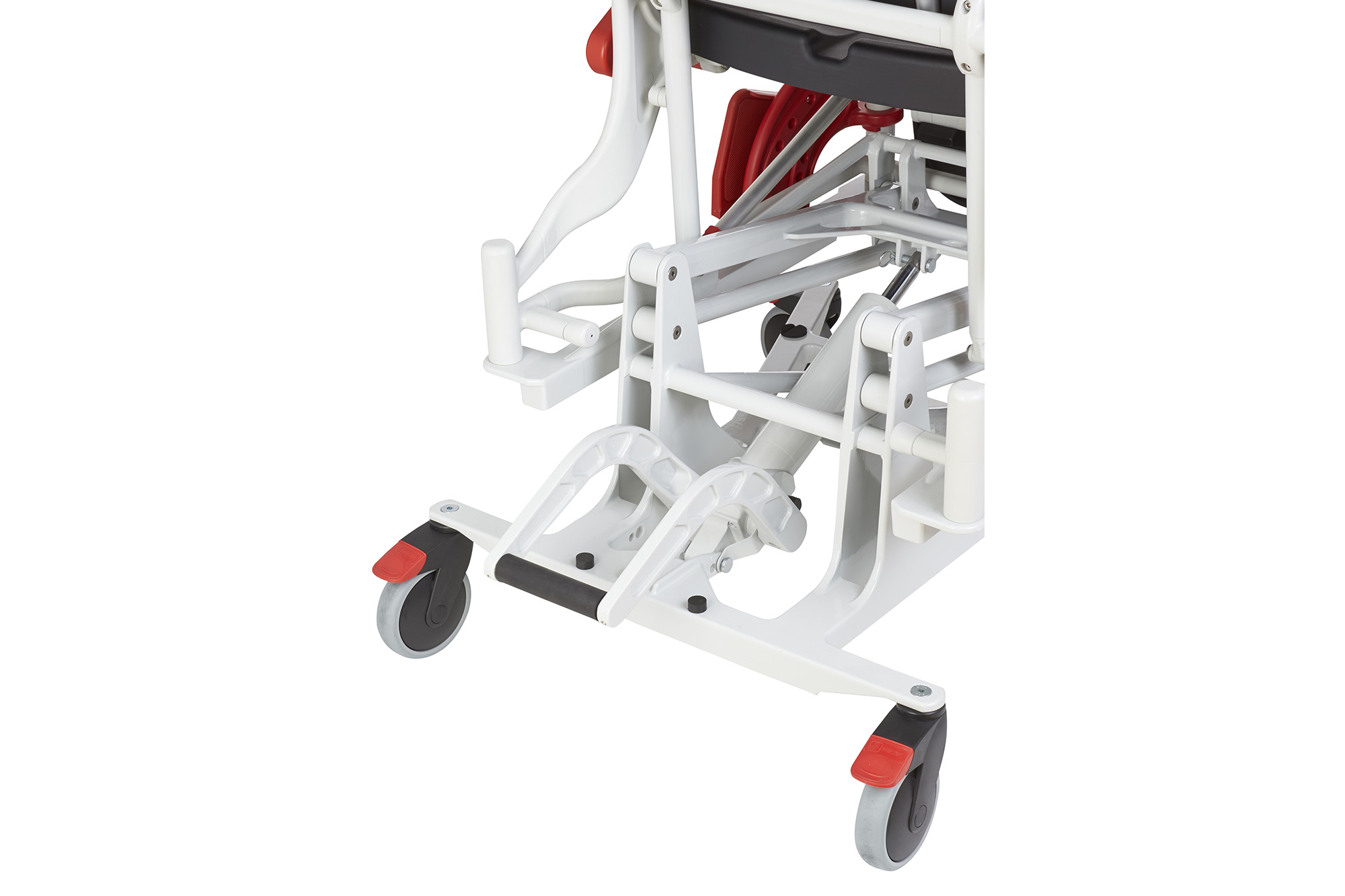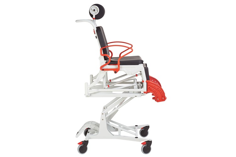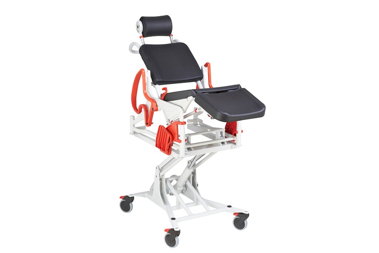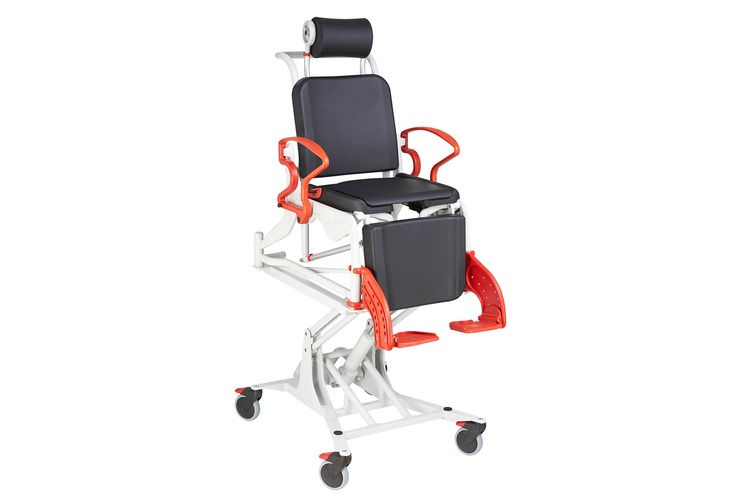 Dusch- und Toilettenstuhl mit Höhenverstellung durch hydraulische Kolben. Gepolsterte Sitzfläche aus Polyurethan mit Hygiene-Schlitz.