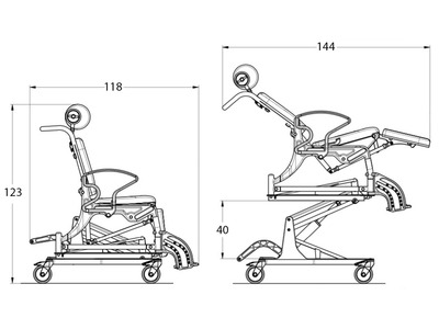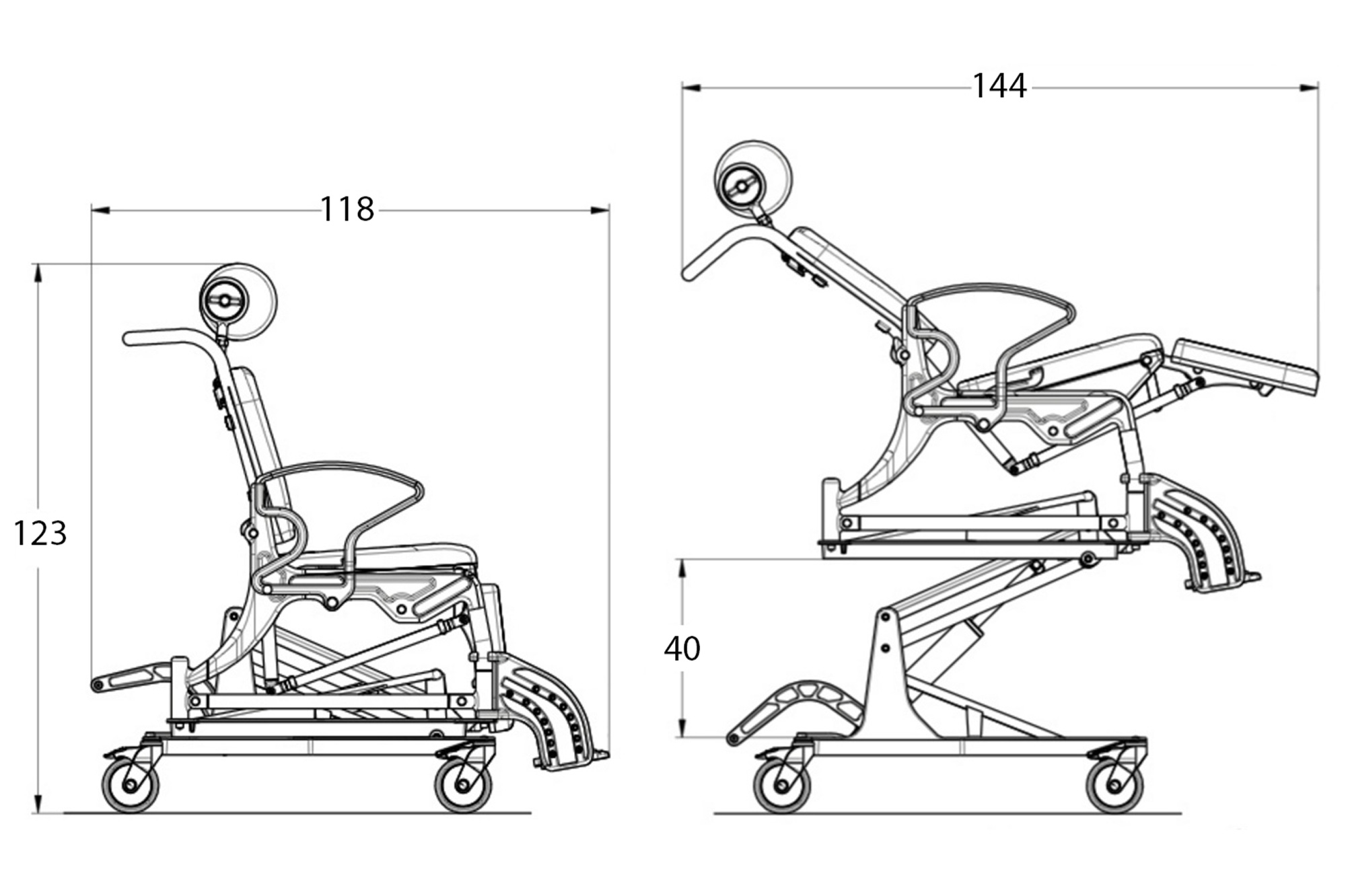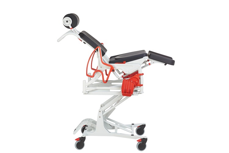 Mit verstellbarer Kopfstütze und abklappbaren Armlehnen ausgestattet. Kippbewegung von Rückenlehne / Sitz / Fußstütze. Der abnehmbare Toilettentopf wird mitgeliefert.